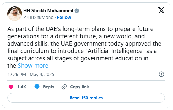 “As part of the UAE’s long-term plans to prepare future generations for a different future, a new world, and advanced skills, the UAE government today approved the final curriculum to introduce Artificial Intelligence’ as a subject across all stages of government education in the UAE, from kindergarten to grade 12, starting from the next academic year,” he wrote on X.